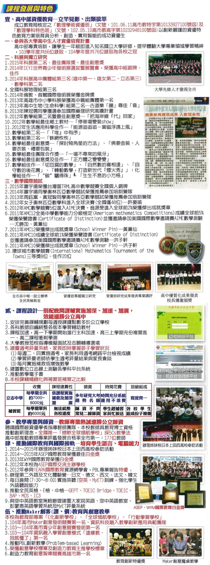 - 卓越升學績效,彈性課程設計,培養多元能力,優質學習環境。