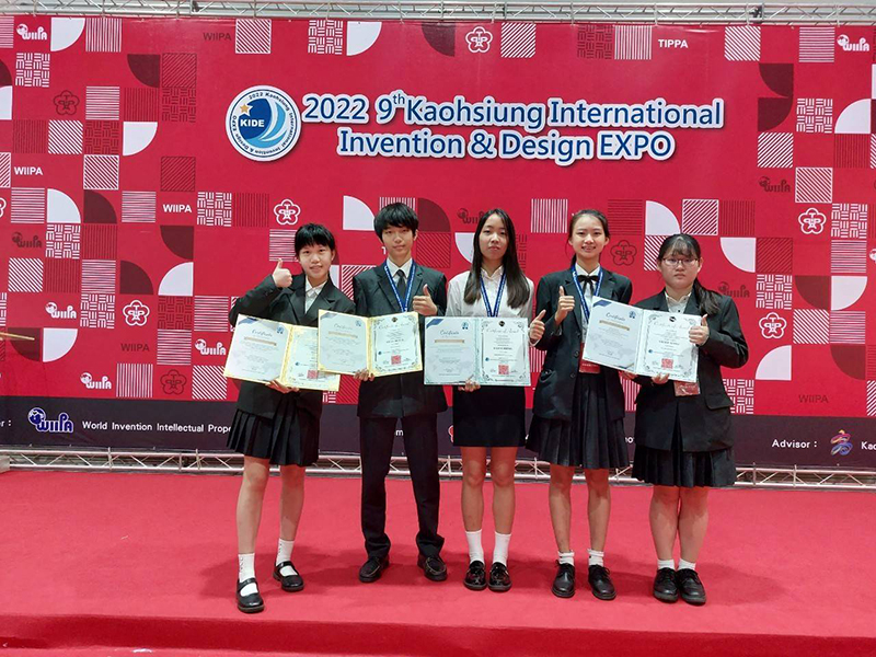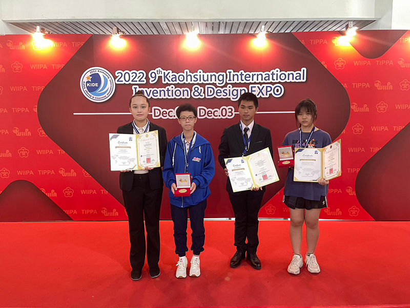 - 陳律彣、林威綸、林怡瑞、佘恩沁學參加2022高雄國際發明暨設計展榮獲2面金牌